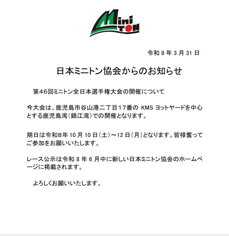 第43回ミニトン全日本選手権大会の帆走指示書をUP |